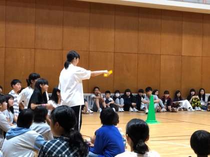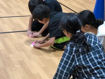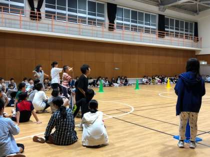 2番目の競技は、遠くへ飛んでゆけ!。決められた時間内に折り紙で紙ヒコーキを作るところからはじめ、その後紙ヒコーキを遠くへ飛ばして、距離を競います。折り方は自由なので、いろいろな型の紙ヒコーキが飛んでいます。