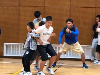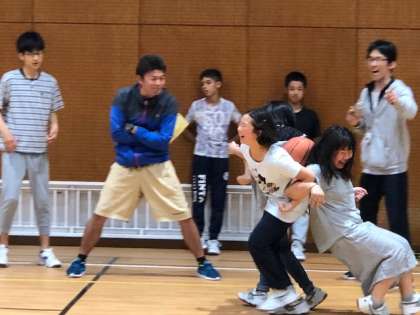 最後の競技は、落とさず運べ。三人一組で背中にバスケットボールをはさんで運びます。意外に真っ直ぐ走るのが難しいです。全員リレーでクラス一丸となって頑張りました。