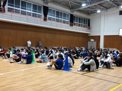 楽しい時間があっという間に過ぎて行きました。レクレーション大会閉会式です。この貴重な時間を過ごせたのは4月から学代会のみんなが中心となって、学年全体が、盛り上がって楽しめるよう何日もかけて準備してくれたおかげです。お疲れさまでした。競技の結果は、1組95点、2組95点、3組105点、4組155点でした。