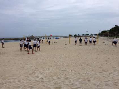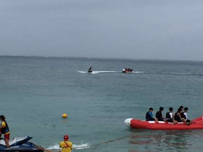 マリンスポーツ体験が始まりました。バナナボート、ビーチバレーを楽しんでます。