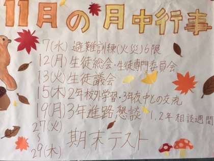 風邪ぎみなのか、マスクをして登校している人も増えています。体調に気をつけ、二学期後半、学校生活を充実したものにしていきましょう。