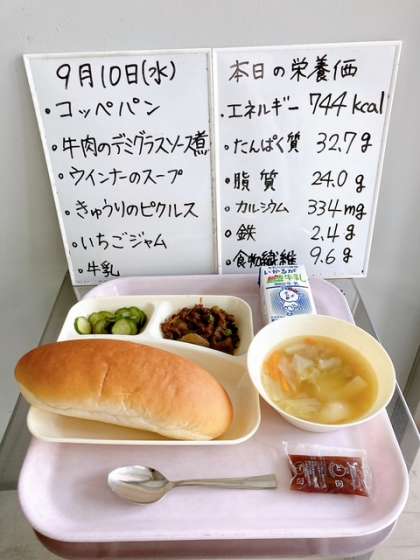 今日のデミグラスソースは新商品の米粉のデミグラスソースを使用しました。小麦アレルギーがある生徒でも食べることができます。