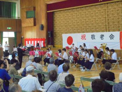 昨日、9月15日(月祝)に平野小学校にて平野小地域の敬老大会が行われました。これまで平野地域で活躍されてきたたくさんの諸先輩方が集まる中、本校吹奏楽部が招待され、皆さんの前で素晴らしい演奏を行いました。特に最後曲の「愛燦燦(あいさんさん)」は会場に来られた皆さんも曲に合わせて大合唱していただきました。
