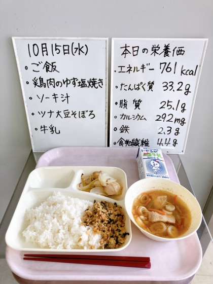 そぼろは、ひき肉や魚、卵などをそのまま、あるいは調味料を加え、パラパラにいったものです。材料を細かくほぐしたものを「おぼろ」と呼び、それより粒が粗いものを「そぼろ」と呼ぶようになり、「そぼろ」となったとも言われています。給食では「ツナ大豆そぼろ」のほかに、「紅鮭そぼろ」や「牛ひじきそぼろ」などが出ます。