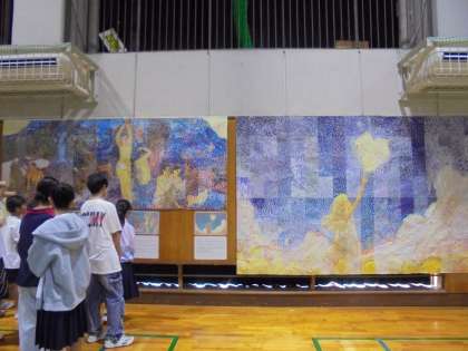 体育館での展示発表、1年生のモザイクアートです。