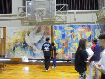 ピカソ、ゴーギャンの2作品と、生徒全員が生成AIを使って「平和、いのち、生き方」というテーマに沿った作品を作り選ばれた2作品をモザイク画にしました。