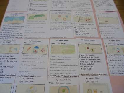 1年生は「夏の思い出」、2年生は「My favorite Japanese food!」、3年生は「My favorite song」をテーマにそれぞれイラストと英作文を作成しました。