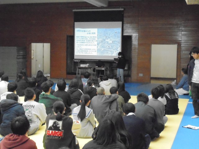 「長崎」「大阪」「特攻隊」「国際情勢」という4つのテーマに分かれ、各班でこれまで調べてきた内容をスライドショーで発表してもらいました。