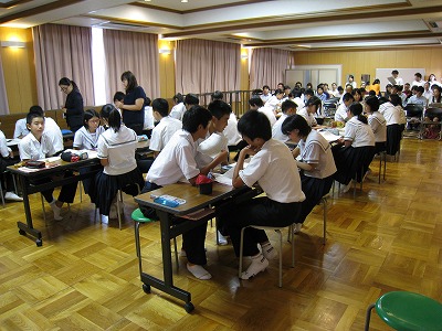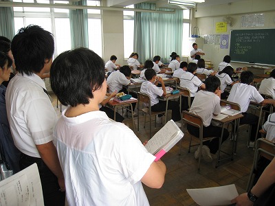 9月4日、本校において、国語、社会、理科、道徳の研究授業を実施しました。他区の学校の教員も多く参加し、研修を深めました。多くの見学者に囲まれ、生徒にとってもよい刺激になったと思います。(写真:左より国語、社会、理科の授業のようす)