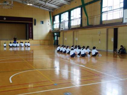 男女に分かれて体力テストの説明を聞いた後、握力測定と長座体前屈に取り組んでいました。