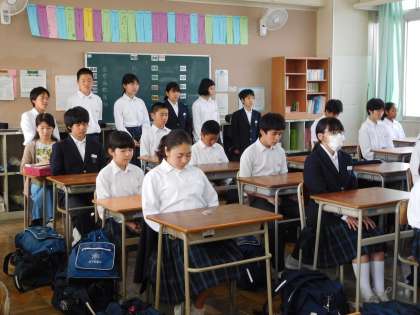 初めの挨拶から黙想、各授業の評価、明日の連絡などをしている様子を、1年生6名が後ろから見学しました。