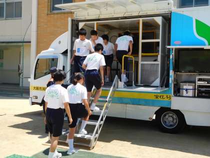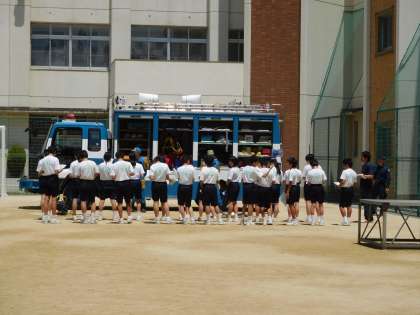 グラウンドでは、警察署の方が災害救助車を持ってきてくださり、車を目の前に見ながら説明を受けました。