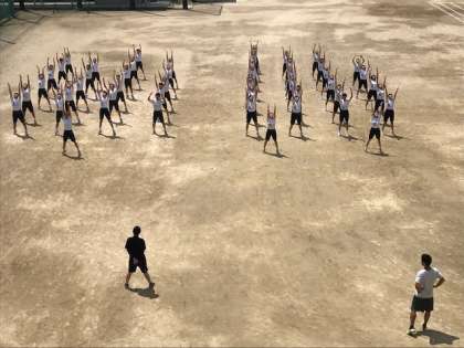 気持ちのよい天気の中、きれいに整列して体操をしています。姿勢や腕の動きも揃っていて、大きな声が学校中に響き渡っていました。