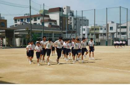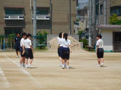 1時間目に1・3年生合同で体育の授業を行いました。まず体育の授業で毎回行うランニングや行進などを3年生が実演し、その後、各クラス男女別のグループに分かれ3年生が1年生に丁寧に教えました。