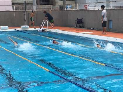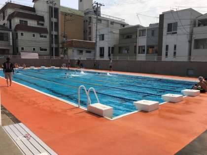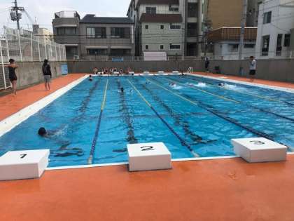 見に行った時には男子はクロール、女子は背泳ぎの練習をしていました。お天気も良くなり、水しぶきがあがって気持ちよさそうでした。