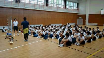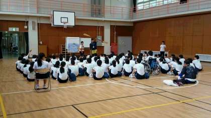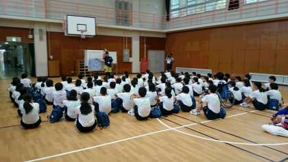 入館式をしています。生徒代表があいさつをした後、自然の家の方から、館内の使い方、海での活動の注意を聞いています。