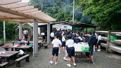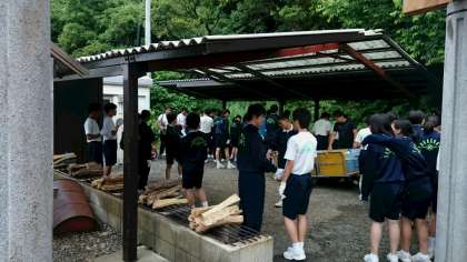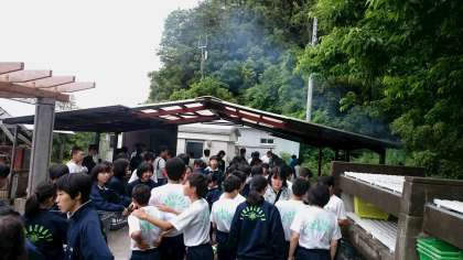野外炊はん それぞれの係が材料やマキを取りに行っています。