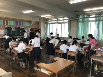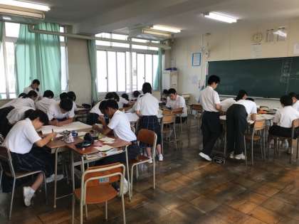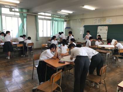 2年生は昨日から一泊移住の壁新聞づくりを始めました。班で協力して何の記事を書くかを話し合い、文字数を考慮してレイアウトを考え、今日から模造紙に下書きを始めました。上手に出来上がれば、7月の懇談の際には廊下に貼る予定ですので、工夫して仕上げていきましょう。
