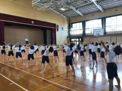 まず、体育館で開会式をした後、準備運動を行いました。