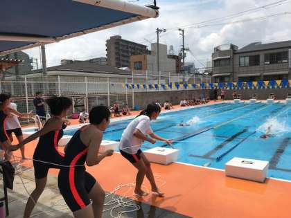 その後プールに移動し、クロールや平泳ぎ、ビート板、水中歩行などの個人種目や「流星」や「浮き輪」などの楽しい種目も行いました。