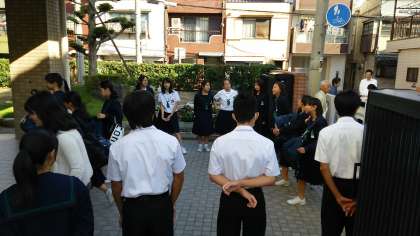 先日、新生徒会役員が決まりました。これまでの伝統を受け継ぎ、新生徒会役員も、毎朝正門で「おはよう運動」を行っています。月・水・金は地域の方とともに実施しています。