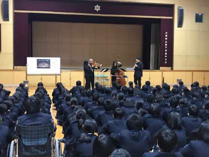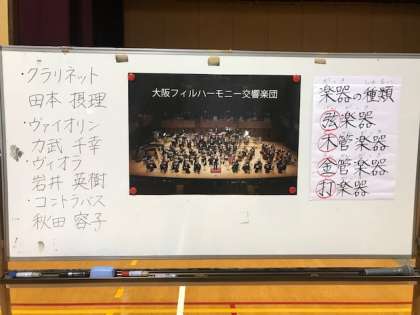 本日の6時間目は大阪フィルハーモニー交響楽団の方が来校されて、出前授業が行われました。西成区に活動拠点をもつプロの素晴らしい演奏を鑑賞することができました。また演奏だけでなく、大フィルのご紹介や楽器のお話、クイズなどあっという間の楽しい1時間でした。