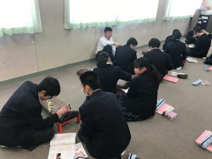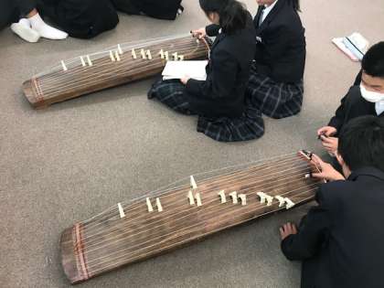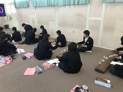 3人に1面の筝を使って、「虫づくし」「姫松」「さくらさくら」などの初心者でも楽しめる曲に取り組んでいます。筝の糸の場所を覚えればすぐに演奏できるので、グループで教えあいながら熱心に取り組んでいました。