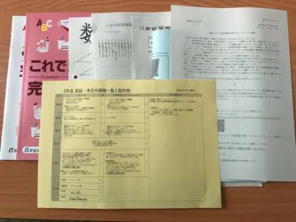 前回の課題を提出し、本日も新しい問題集や冊子を配布しました。通信環境に関するアンケートも配布しています。オンラインのアンケートになりますので、回答ができない場合は、学校までご連絡ををお願いいたします。