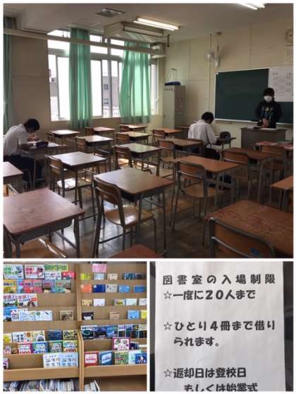 マスクをして元気に登校できています。明るい声が学校に響いており、活気が感じられて嬉しく思います。これまでの課題を回収した後、質問をしたい生徒は残って学習しました。図書室も開館しており、一人4冊まで借りることができます。