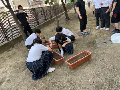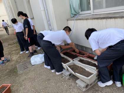 みどり学級では、植物を育てています。この日は、土を混ぜ、肥料を入れ、ひまわりなどの種を植えました。毎日、水やりをしています。
