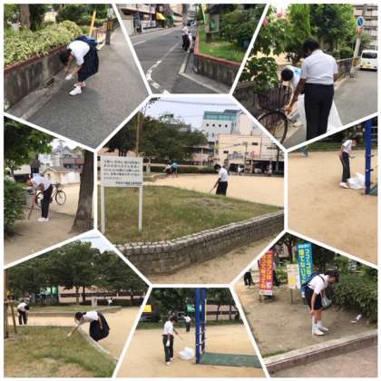 その後生徒会主催で校区内清掃を行いました。有志で集まったメンバーが、縦割りで6班に分かれて校区内を回り、ゴミ拾いをしました。吸い殻やペットボトルなど、たくさんのゴミが集まりました。