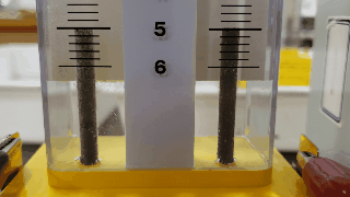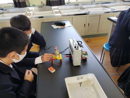 本日、2年1組は水の電気分解の実験を行いました。水の化学式はH2Oです。水素原子と酸素原子でできているため、電流を流すと水素と酸素が発生します。酸素に火のついた線香を入れると炎を上げて燃えるのですが、線香を差し込みすぎて水で消えてしまった班もありました。