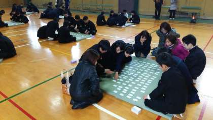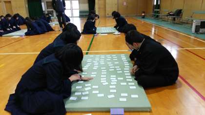 1月28日、2年生百人一首大会を実施しました。各クラス対抗とあって、力の入った戦いとなりました。また、各クラスから2名ずつの代表を出して戦う名人戦では、レベルの高い熱い戦いとなりました。参観に来られた保護者の方が、名人戦にご参加する場面もありました。対戦結果は次のとおりです。