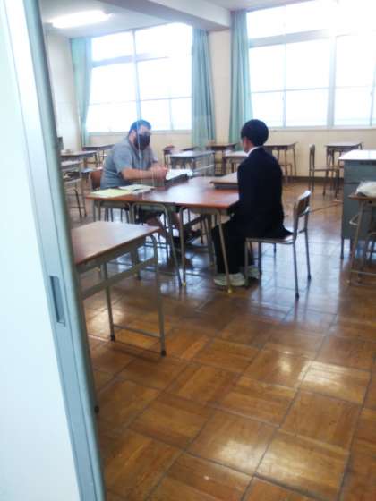 聞いていました。順番が来るまで、各自インタビューテストの練習をしたり、問題集をしたりして待っていました。緊張した生徒もあり。