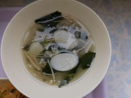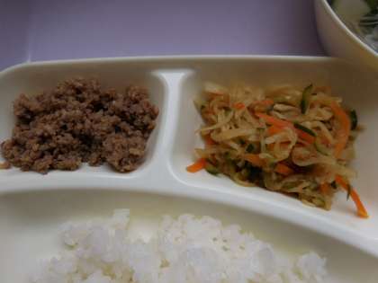 4月13日(火)の給食はビビンバ、トック、入り黒豆、牛乳です。ビビンバは牛、豚のひき肉、にんにく、コチジャン、キュウリ、にんじん、切り干し大根が入っています。トックはたまねぎ、こまつな、えのきたけ、トックが入った中華スープです。おいしかったです。ごちそうさまでした。