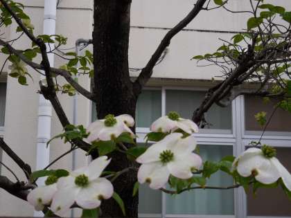 4月14日(水)正門横のハナミズキがきれいな花を咲かせています。