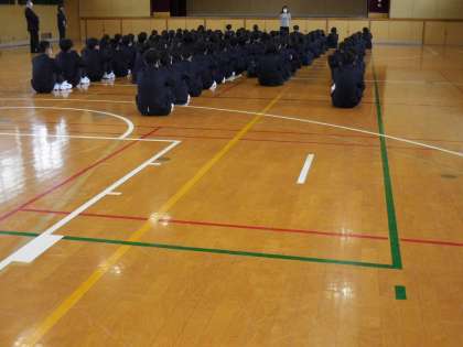 4月16日(金)1年生は体育館で学年集会です。しっかり先生の話を聞いています。