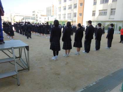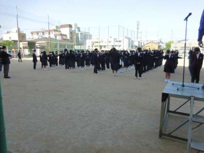4月19日(月)爽やかな朝、子ども達は元気に登校しています。令和3年度、初めての全校集会です。