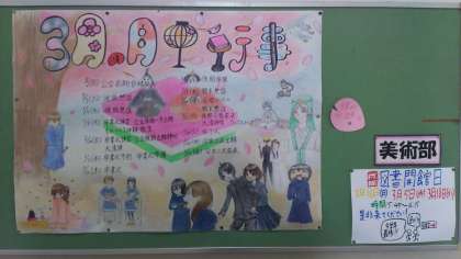 美術部による3月の行事予定表が張り出されました。桃の節句と卒業式がモチーフとなったデザインとなっています。