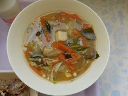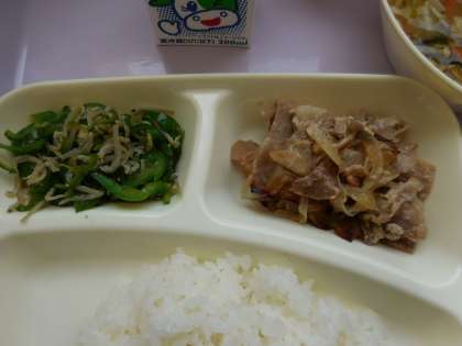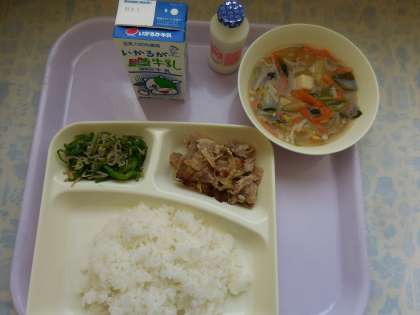 4月23日(金)の給食は豚肉のしょうが焼き、みそ汁、じゃこピーマン、発酵乳、ごはん、牛乳です。豚肉のしょうが焼きは豚肉、たまねぎ、しょうがが入っています。みそ汁はとうふ、キャベツ、ごぼう、えのきたけ、わかめ、が入っています。じゃこピーマンはちりめんじゃことピーマンが甘辛くあえています。おいしかったです。ごちそうさまでした。