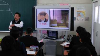 2年生の社会科の授業のようすです。茶の湯の文化に関わり、茶人、千 利休や天下茶屋の地名の由来などを、電子黒板に映し出される映像も使い分かりやすく解説しています。