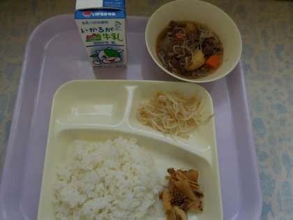 5月6日(木)の給食は肉じゃが、もやしのゆずの香あえ、ごまかかいため、ごはん、牛乳です。肉じゃがは牛肉、じゃがいも、糸こんにゃく、たまねぎ、にんじんが入っています。もやしのゆずの香あえはブラックマッペもやしにゆずの香りがします。ごまかかいためはたけのこにかつおぶしと醤油で味付けしています。おいしかったです。ごちそうさまでした。
