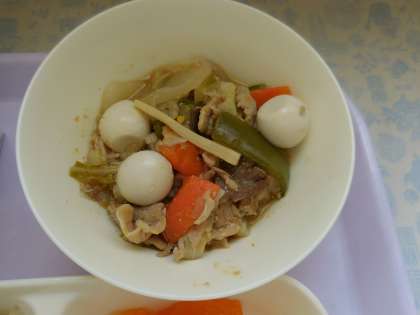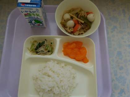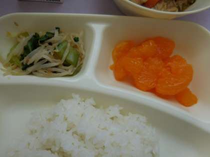 5月10日(月)の給食は八宝菜、チンゲンサイともやしのしょうがあえ、みかん、ごはん、牛乳です。八宝菜は豚肉、うずら卵、たまねぎ、キャベツ、にんじん、たけのこ、ピーマン、しいたけが入っています。チンゲンサイともやしのしょうがあえはチンゲンサイとブラックマッペもやしを甘辛くしょうがの風味がします。おいしかったです。ごちそうさまでした。