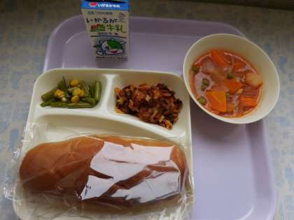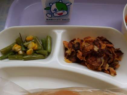 5月12日(水)の給食はケッチャプ煮、さんどまめんとコーンのソテー、りんごのクラフティ、パン、牛乳です。ケッチャプ煮は鶏肉、じゃがいも、たまねぎ、にんじん、グリンピースが入っています。さんどまめとコーンのソテーはさんどまめとコーンが入ったあっらり味です。りんごのクラフティはこんがり焼けておいしかったです。ごちそうさまでした。