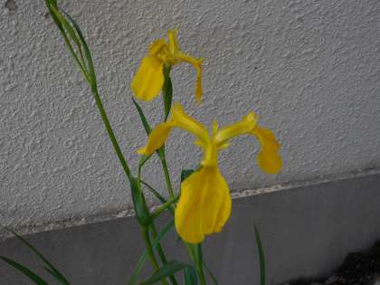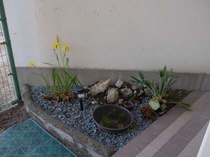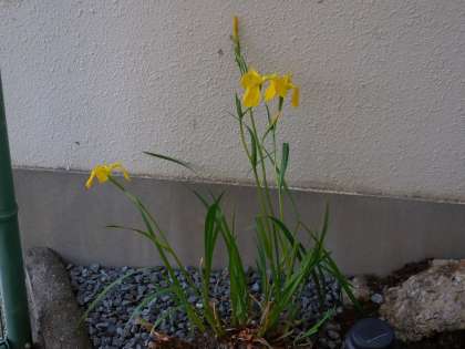 5月13日(木)昨日からの雨もすっかり上がりさわやかな風が吹いています。1階の玄関付近の運動場側の小さなスペースに管理作業員さんが黄菖蒲を植えてくれました。黄色のきれいな花が咲いています。その横ではメダカが楽しそうに泳いでいます。