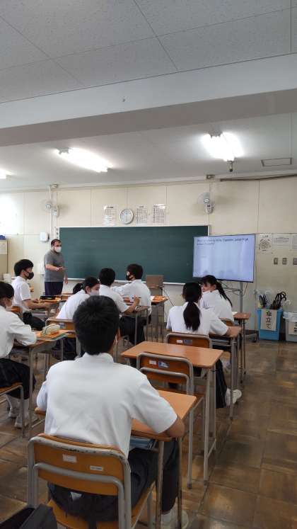 Alex先生の授業。今日は1組2組でした。今日もみな元気いっぱいでした。受動態の文法をペアーで文を作成したりしながら確認。その後、曲名や歌手名をあてるゲーム性のある活動でした。2組は早く進んだので、別の曲も聞くことができました。