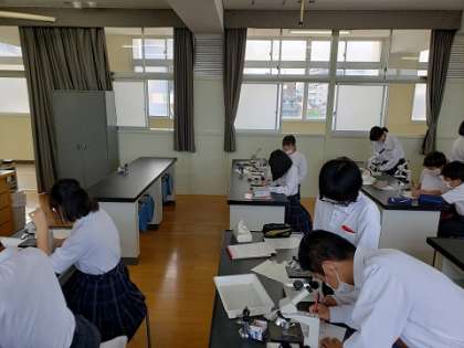 昨日と本日、3年生は理科室で観察を行いました。顕微鏡で細胞分裂のようすや、染色体の観察を行いました。たくさんの細胞1つ1つに染色体が見られたことに驚いている生徒もいました。