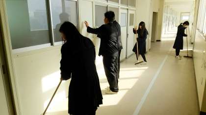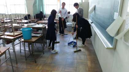 3月10日、3年生では、最後の大掃除をしました。これまで使ってきた教室などを、感謝の気持ちをもってきれいにしました。掲示物のなくなった教室で、「いっきにさみしくなった」と感想をもらす生徒もたくさんいました。