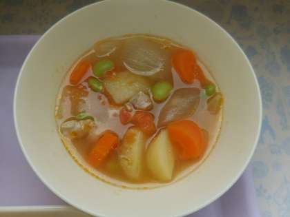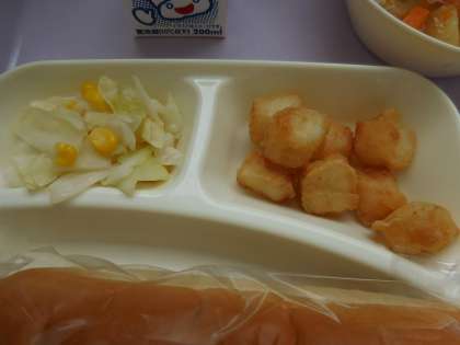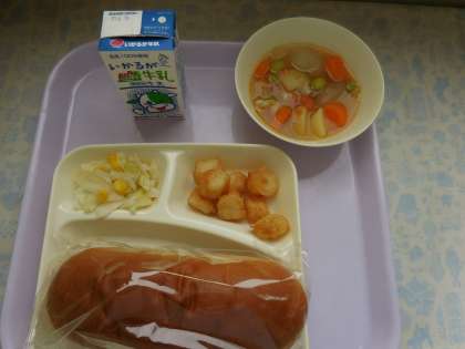 6月2日(水)の給食はいかのてんぷら、フレッシュトマトのスープ煮、サワーソテェー、パン、牛乳です。いかのてんぷらはからっと揚がっています。フレッシュトマトのスープ煮は鶏肉、じゃがいも、たまねぎ、トマト、にんじん、むきえだまめが入っています。サワーソテェーはキャベツとコーンのあっさり仕立てです。おいしかったです。ごちそうさまでした。
