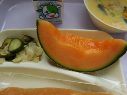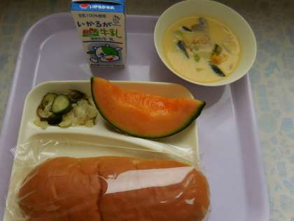 6月4日(金)の給食はかぼちゃのクリームシチュー、ミックス海そうサラダ、クインシーメロン、パン、牛乳です。はかぼちゃのクリームシチューは鶏肉、たまねぎ、ベーコン、かぼちゃ、むきえだまめ、マッシュルームが入っています。ミックス海そうサラダはキャベツ、きゅうり、ミックス海そうが入っています。クインシーメロンは大人気でした。おいしかったです。ごちそうさまでした。